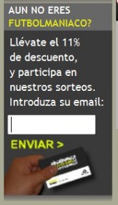 Consigue un cupón descuento del 11% para Futbolmania, lo consigues sólo por registrarte en el newsletter dejando tu email. Es muy fácil; y un 11% es un muy buen descuento.
